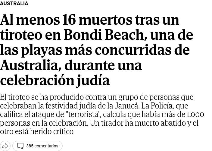 Cita de: Admin en Ayer a las 11:15Al menos 10 muertos tras un tiroteo en Bondi Beach, una de las playas más concurridas de Australia; uno de los tiradores ha sido abatido