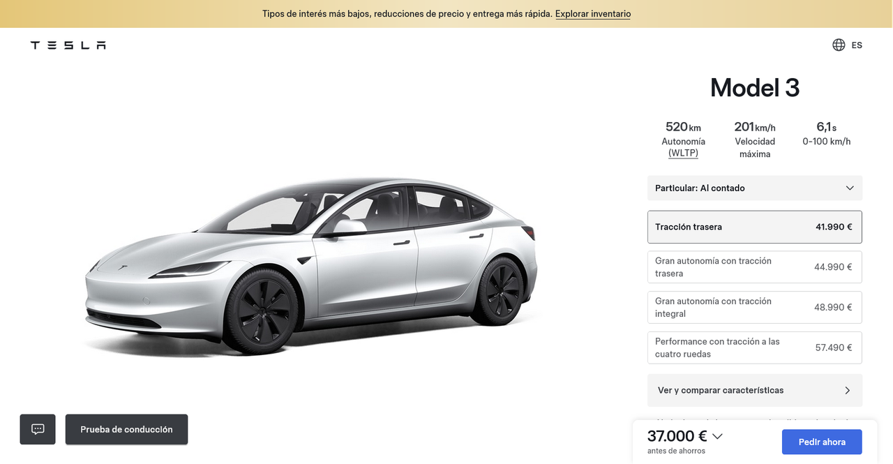 Buenas noches. Han bajado el precio del Model 3 tracción trasera a 37.000 €. Recordemos que lleva unos días en 42.000 €. Supongo que este será el nuevo precio con las modificaciones hechas de cámara y palanca de intermitentes.
