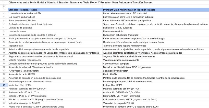 Diferencias Model Y Standard Tracción Trasera y Premium LR Tracción Trasera